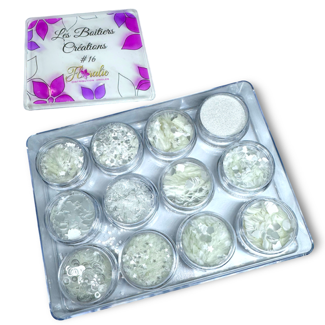 Boitiers créations Floralie Ce boitier contient 12 couleurs de paillettes différentes.