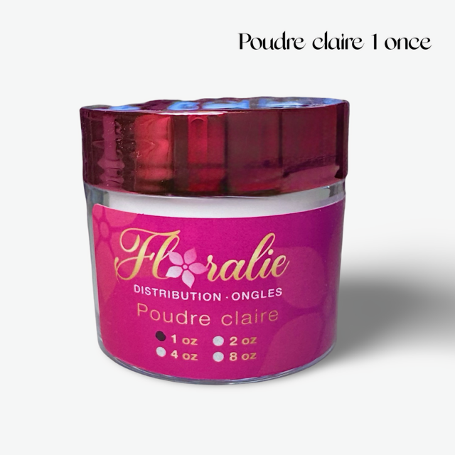 Poudre claire pot de 1 once. Nos poudre sont conçus pour la résine mais sont compatible pour l’acrylique et le gel et poudre.