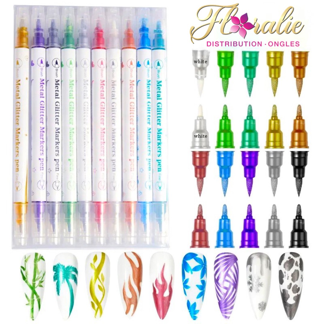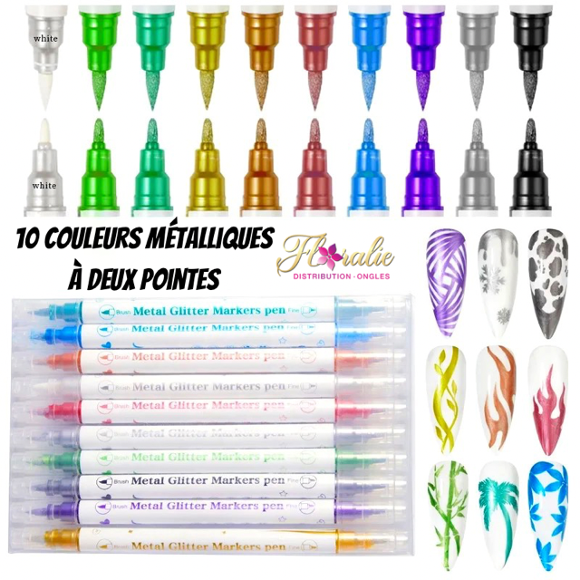 10 stylos à deux pointe de couleurs métallique pour nail art.